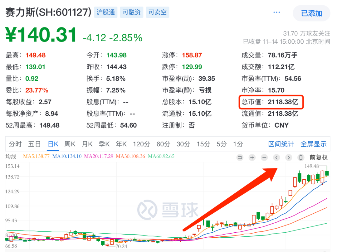 在股票市集,11月13日,赛力斯股价络续高涨,以高开高走的态势收盘,涨幅达到7.33%,报收于每股144.43元,总市值为2180亿元,超越了上汽集团,踏进上市车企总市值第一梯队。
