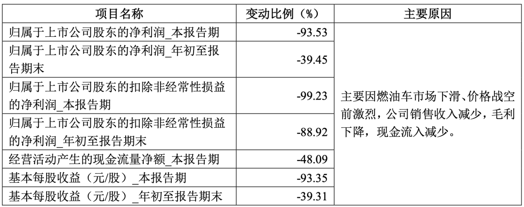 长安汽车方面,该季度买卖收入为342.37亿元,同比下降19.85%;净利润为7.48亿元,同比下降66.44%;扣非净利润为5.12亿元,同比下降74.96%。